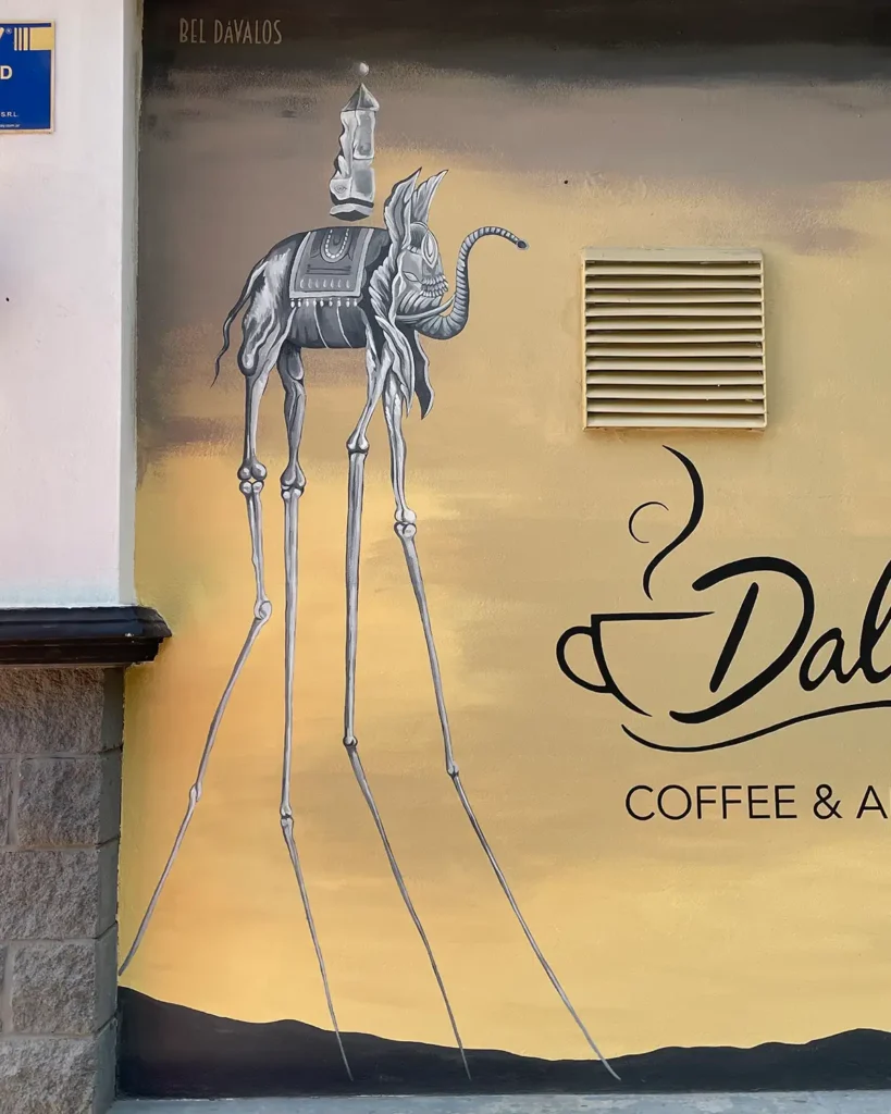 Este proyecto consistió en la realización de un mural exterior para una cafetería en Moreno, pensado como una intervención artística que acompañara la identidad del local y aportara presencia visual a la fachada. La propuesta toma como referencia los icónicos elefantes de Salvador Dalí, reinterpretados desde un lenguaje propio, adaptado al espacio y al contexto urbano.